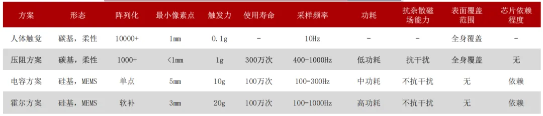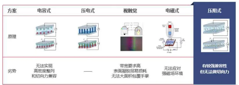 压阻式方案具有五大优势: 1)适配性强;2)检测灵敏度高;3)全掌覆盖;4)通信带宽要求低;5)指尖切向力测量可通过其他结构方式弥补。