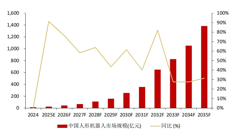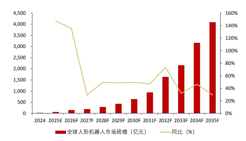 全球市场:到2030年,全球人形机器人市场销量将接近34万台,市场规模将超过640亿元;到2035年,全球人形机器人市场销量将超过500万台,市场规模将超过4000亿元。