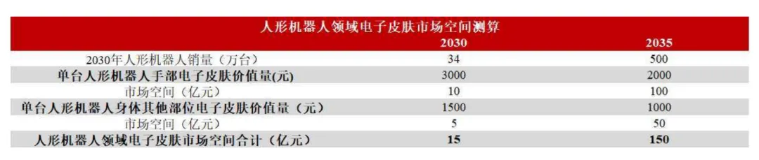 预计2035年,人形机器人领域电子皮肤市场空间有望达150亿元。根据高工机器人产业研究所对2030和2035年人形机器人销量预测, 假设2030年、 2035年手部电子皮肤价值量为3000元、2000元; 由于身体其他部位所需的传感器数量较少,价值量为手部的50%,则为1500元、 1000元,预计2035年,人形机器人领域电子皮肤市场空间有望达150亿元。