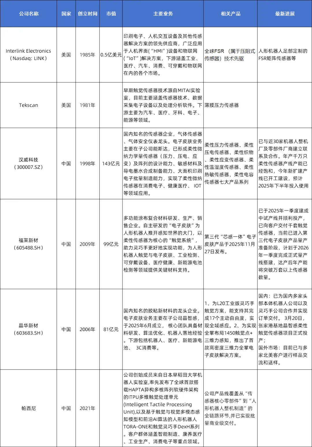 高端产能海外公司主导, 全球CR5占57%, 国内企业技术迭代加速推进。根据华经产业研究院信息, 柔性触觉传感器(电子皮肤)高端产能被外国占据,全球排名TOP5的厂商合计占有大约57.1%的市场份额。人形机器人领域电子皮肤主要海外厂商有Interlink Electronics、Tekscan等, 国内主要有汉威科技、福莱新材、晶华新材、日盈电子、帕西尼、墨现科技等。