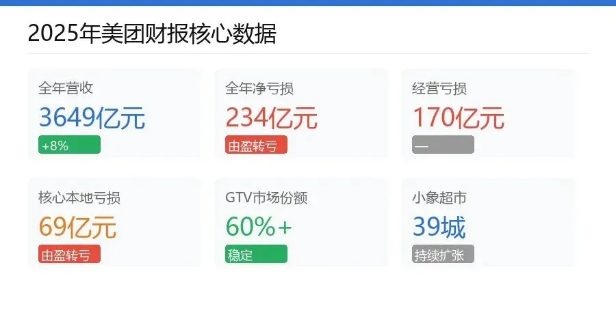 美团2025年全年财报给出了答案:净亏损234亿元,经营亏损170亿元。