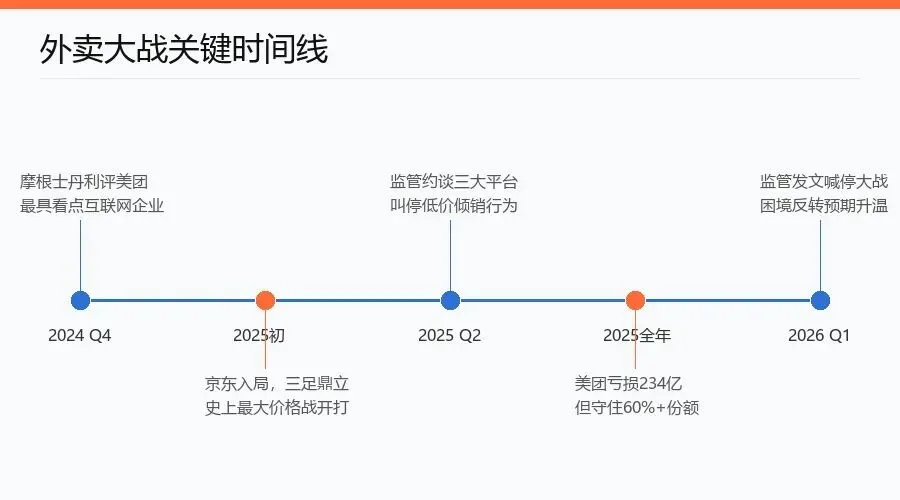 这不是官方第一次出手。早在2025年5月,国家市场监管总局就联合五部门约谈了美团、饿了么、京东外卖三大平台,直指低价倾销、虚假宣传、骑手超负荷等问题。2026年1月,国务院反垄断委员会办公室再次点名三家平台,批评"拼补贴、拼价格、控流量"问题突出。