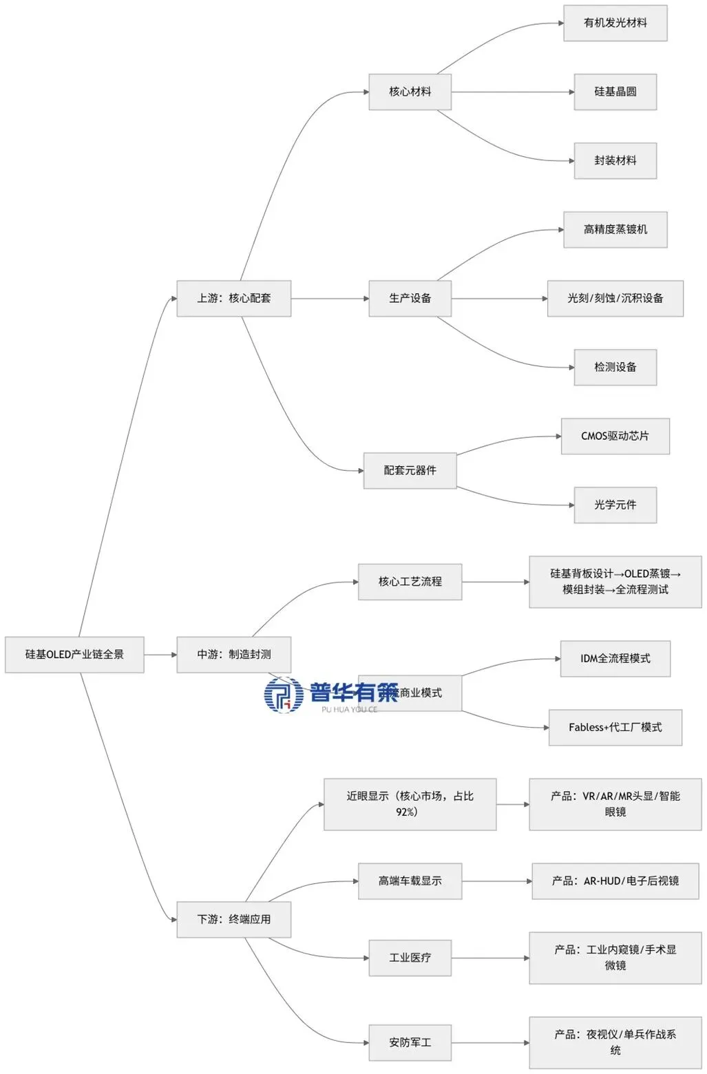 硅基OLED的产业链条清晰,分为上游核心配套、中游制造封测、下游终端应用三大环节,整体呈现技术壁垒高、产业链协同性强、海外厂商在核心环节占据主导的特点。
