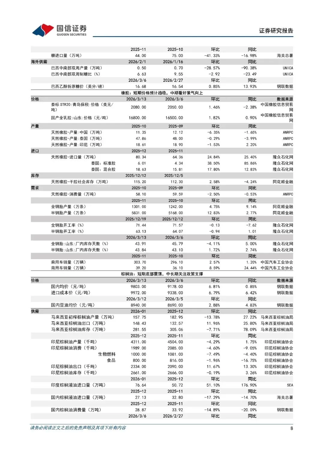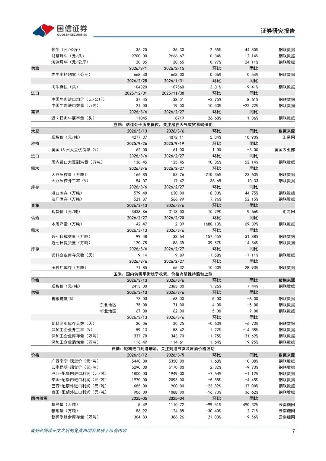 生猪:反内卷有望支撑猪价中长期表现。3月13日生猪价格10.03元/公斤,周环比-2.53%;7kg仔猪价格约317元/头,周环比-7%。