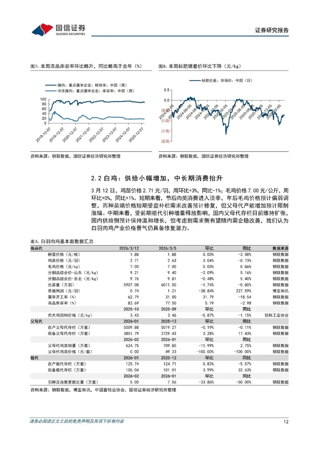 白鸡:供给小幅增加,关注旺季消费修复。3月12日,鸡苗价格2.71元/羽,周环比+3%,同比-1%;毛鸡价格7.00元/公斤,周环比+0%,同比+1%。