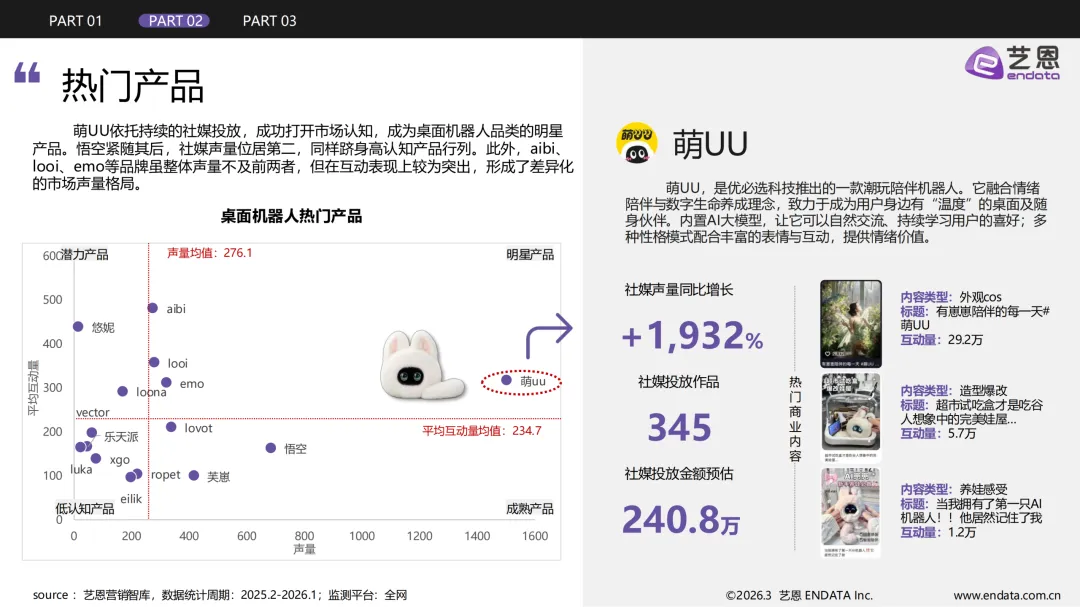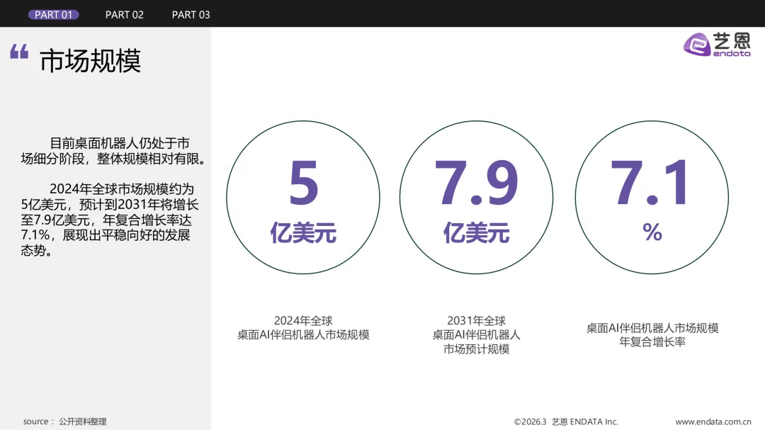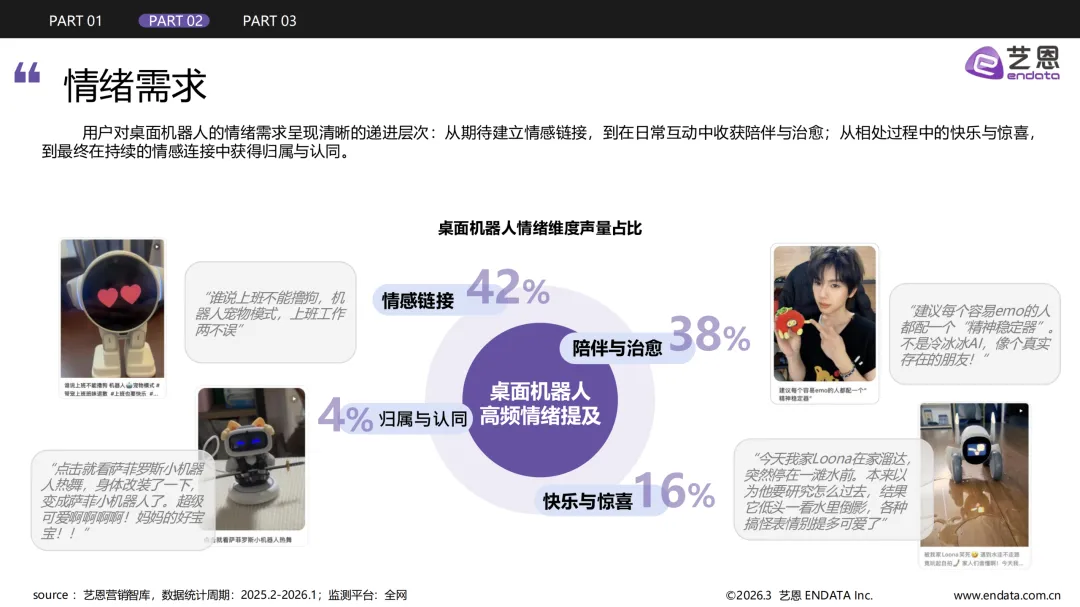 2026年桌面机器人正从功能工具转向人格化伙伴,全球市场仍处细分增长期,中国品牌表现亮眼。中端价位走量最快,仿生、类人、屏机结合是主流形态,陪伴、教育、办公是核心场景。社媒讨论量大涨,25–44岁用户是主力,资本热度持续走高,产品往口袋化、无屏化、低交互高陪伴方向进化,情感价值成行业核心竞争力。