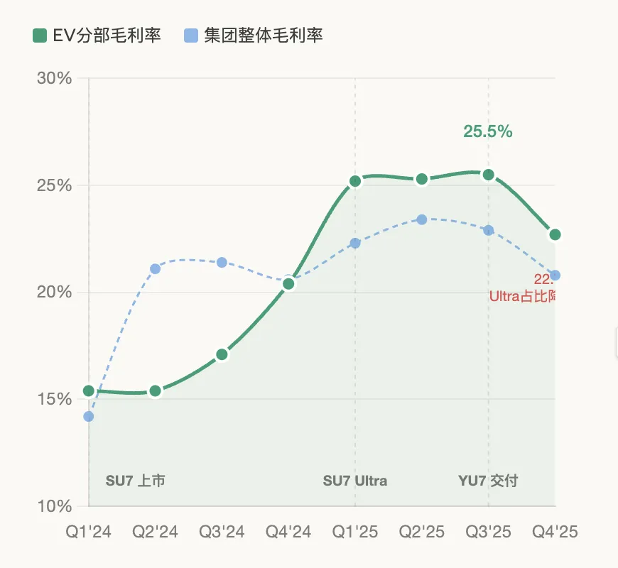 智能电动汽车的ASP(平均售价)也在上升,从2024年Q4的约23.4万元涨至2025年Q4的约25万元,增幅6.6%,主要因为交付了更高客单价的YU7系列。