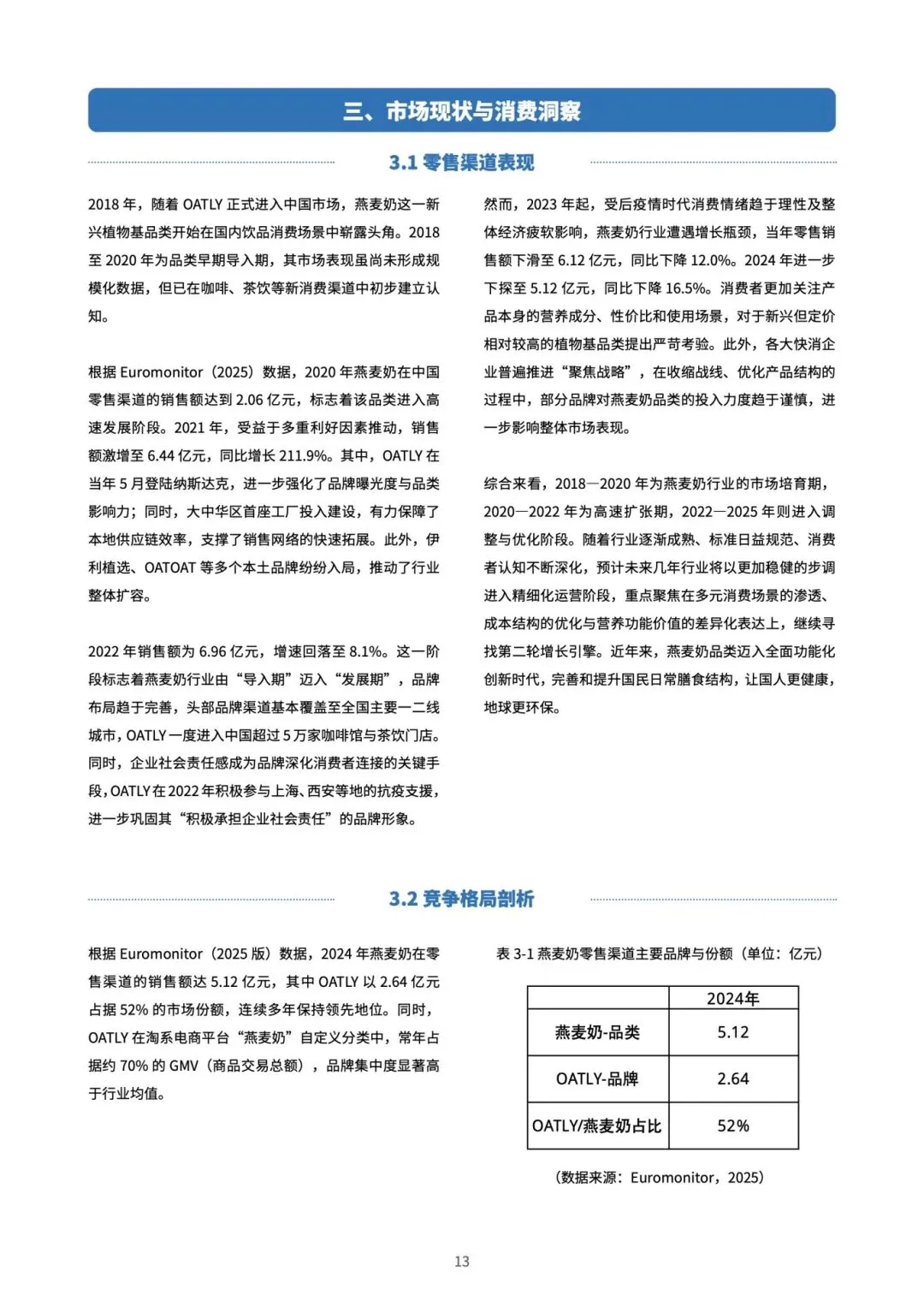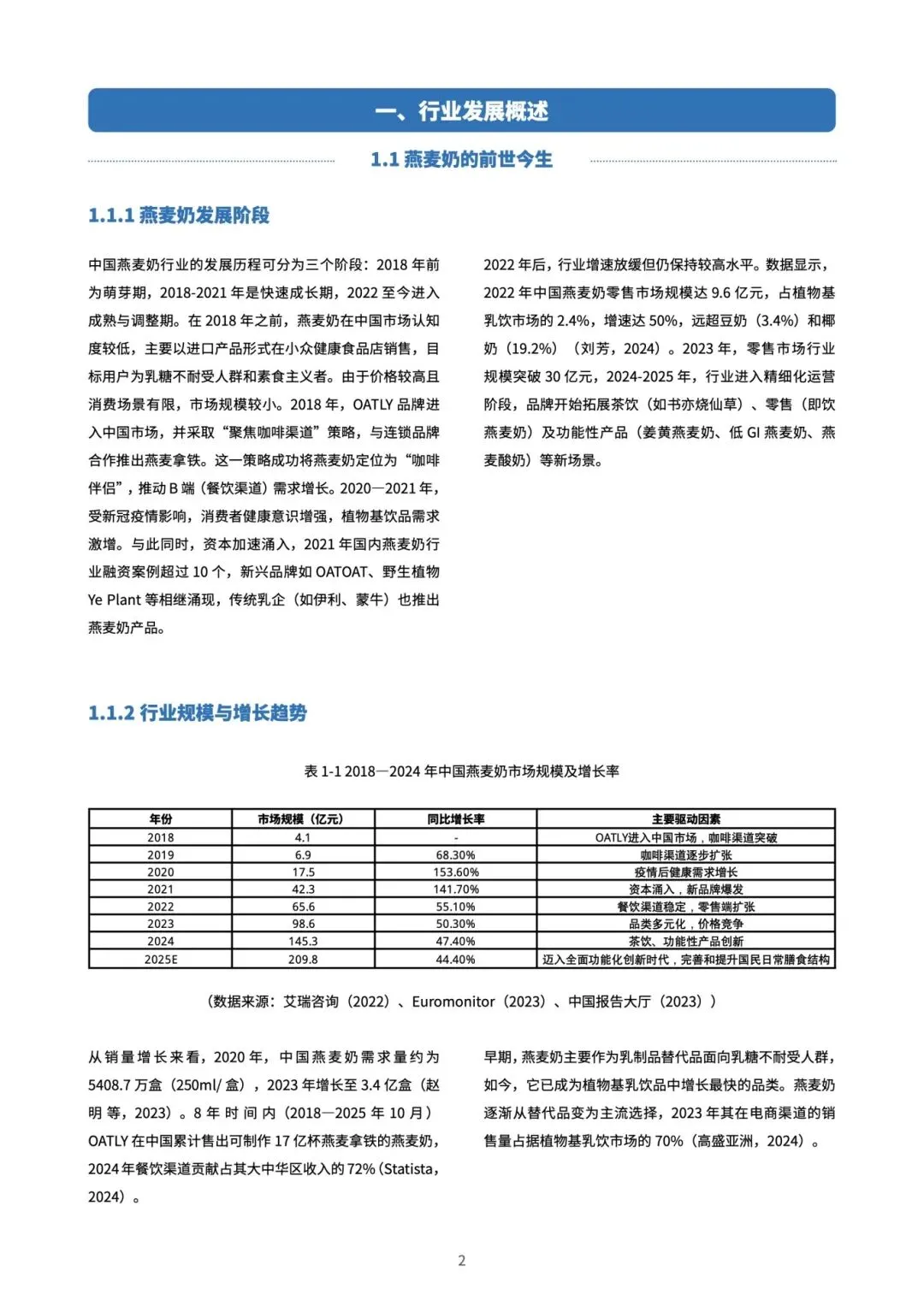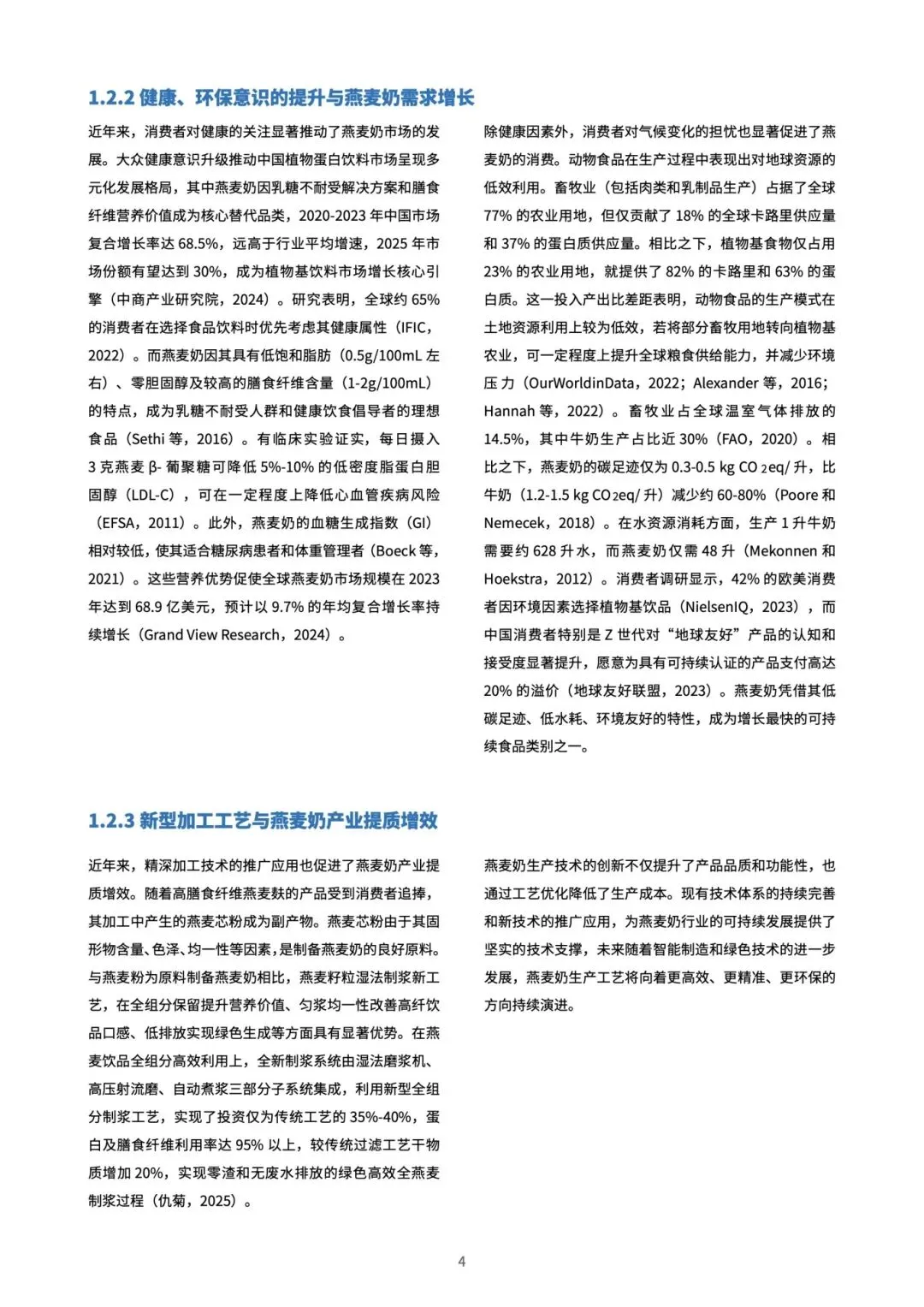 报告梳理中国燕麦奶行业发展历程与现状,分析政策导向、健康环保需求、技术进步对行业的推动作用,聚焦产品创新、市场竞争、消费洞察等核心维度,指出行业从高速增长进入精细化运营阶段,功能化、场景化、本土化成为未来发展主线。