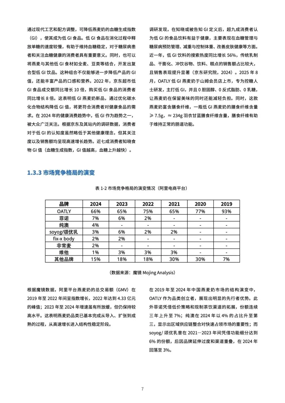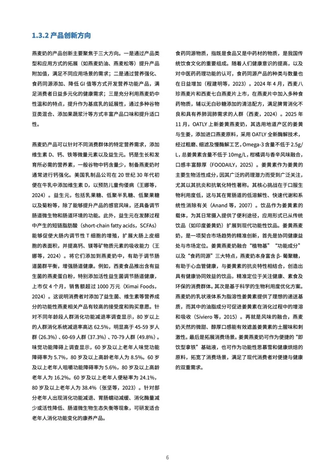 行业规模持续增长但进入调整期:2018-2021 年行业高速扩张,2022 年后增速放缓但仍保持高位,2023 年零售市场规模达 98.6 亿元,预计 2025 年突破 200 亿元。市场从品类教育向品牌深化过渡,OATLY 保持领先地位,本土品牌通过差异化竞争崛起。 政策与需求双轮驱动行业发展:国家 “健康中国”“三减三健”“全谷物行动计划” 等政策为行业提供发展契机,燕麦奶的低糖、高纤维、低碳环保特性契合消费者健康与可持续需求,成为乳糖不耐受人群、健康饮食倡导者的重要选择。 产品创新聚焦功能化与场景化:功能创新覆盖特定人群(运动人群高蛋白、亚健康人群药食同源、儿童营养强化、中老年慢病适配),推出低 GI、高纤、抗炎等细分产品;场景拓展从咖啡伴侣向茶饮、代餐、即饮等多元场景延伸,口味与包装创新增强消费粘性。 技术革新提升产业竞争力:酶解技术解决产品稳定性与营养转化问题,发酵技术优化风味与功能性,高压均质、超高温杀菌、膜分离等技术提升产品品质与保质期。本土化生产工艺改进降低成本,推动产品性价比提升与市场下沉。 市场竞争呈现分层化格局:头部品牌 OATLY 凭借渠道先发优势与品牌心智占据高端市场,本土品牌通过低价策略、区域供应链整合抢占大众市场。竞争焦点从品类扩张转向功能差异化、成本控制与渠道精细化,传统乳企入局加剧市场竞争。