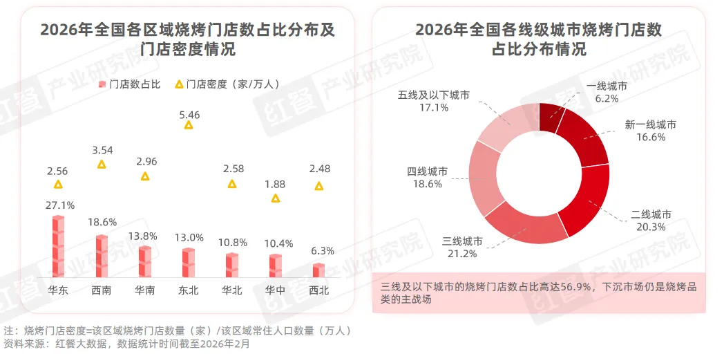 与此同时,受餐饮市场竞争加剧的影响,2023—2026年,全国烧烤门店呈先升后降趋势,截至2026年2月,全国烧烤门店数量已降至40.9万家,较2024年9月下降了20.9个百分点,表明烧烤赛道的竞争依然十分激烈。