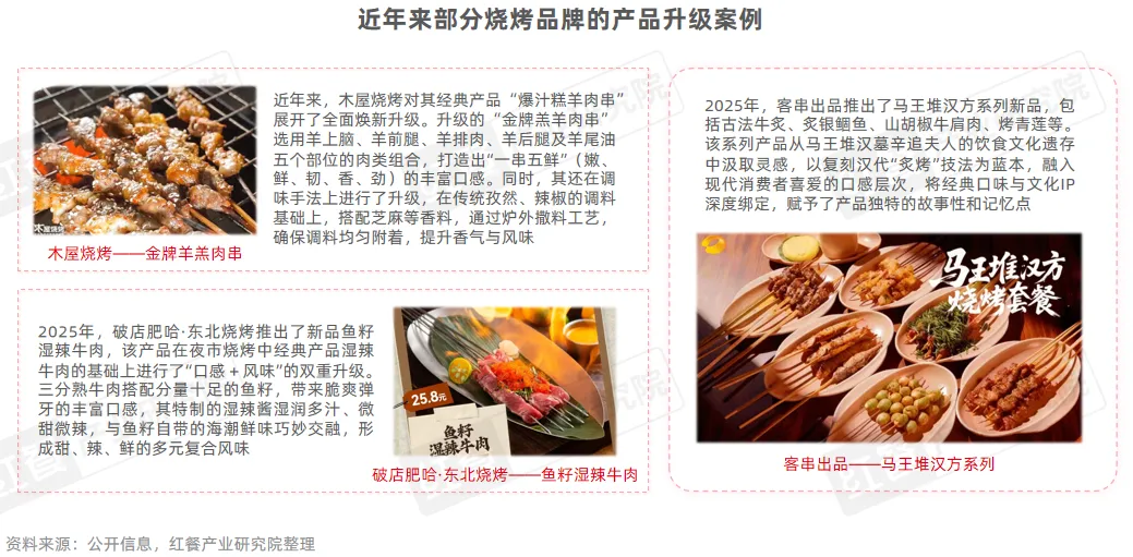 例如,木屋烧烤将其经典产品“爆汁糕羊肉串”升级为“金牌羔羊肉串”;破店肥哈·东北烧烤推出的新品鱼籽湿辣牛肉通过鱼籽与湿辣牛肉的创新搭配;客串出品推出的马王堆汉方系列新品则将经典口味与文化IP深度绑定。