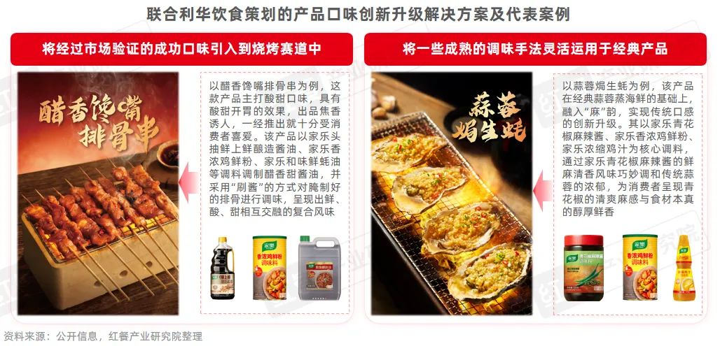 以联合利华饮食策划为例,其凭借对市场的深度洞察与实践验证,将经过市场验证的成功口味以及成熟的调味手法引入到烧烤赛道中,推出了醋香馋嘴排骨串、蒜蓉焗生蚝等菜品解决方案。