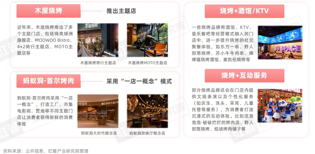比如,木屋烧烤、蚂蚁洞·首尔烤肉等品牌通过推出不同的主题门店、概念店等方式,持续为消费者带来新奇的体验感;东方一串、野人部落烧烤、苏小牛牛肉串、啤啤猫烧烤酒馆、麦凯伦烧烤等品牌将烧烤与酒馆、KTV、音乐餐吧等模式融入到门店中;而流浪泡泡·破破烂烂的烤肉店、焰请烤肉铺子等品牌则凭借文娱表演与个性化服务,为消费者带来多样化的体验。