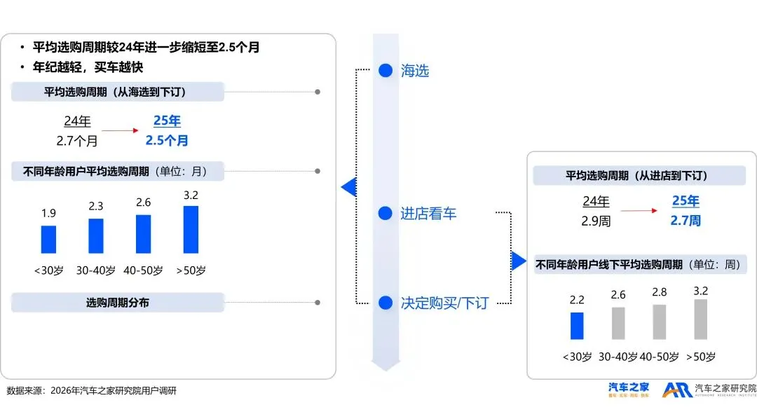 用户从海选到下订的平均选购周期较24年进一步缩短至2.5个月,其中,越年轻的用户,决策速度越快。他们不再愿意花几个月的时间反复比价,而是追求高效的消费体验。
