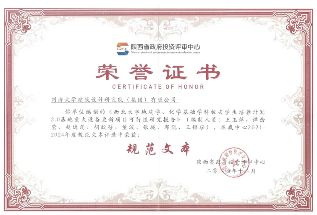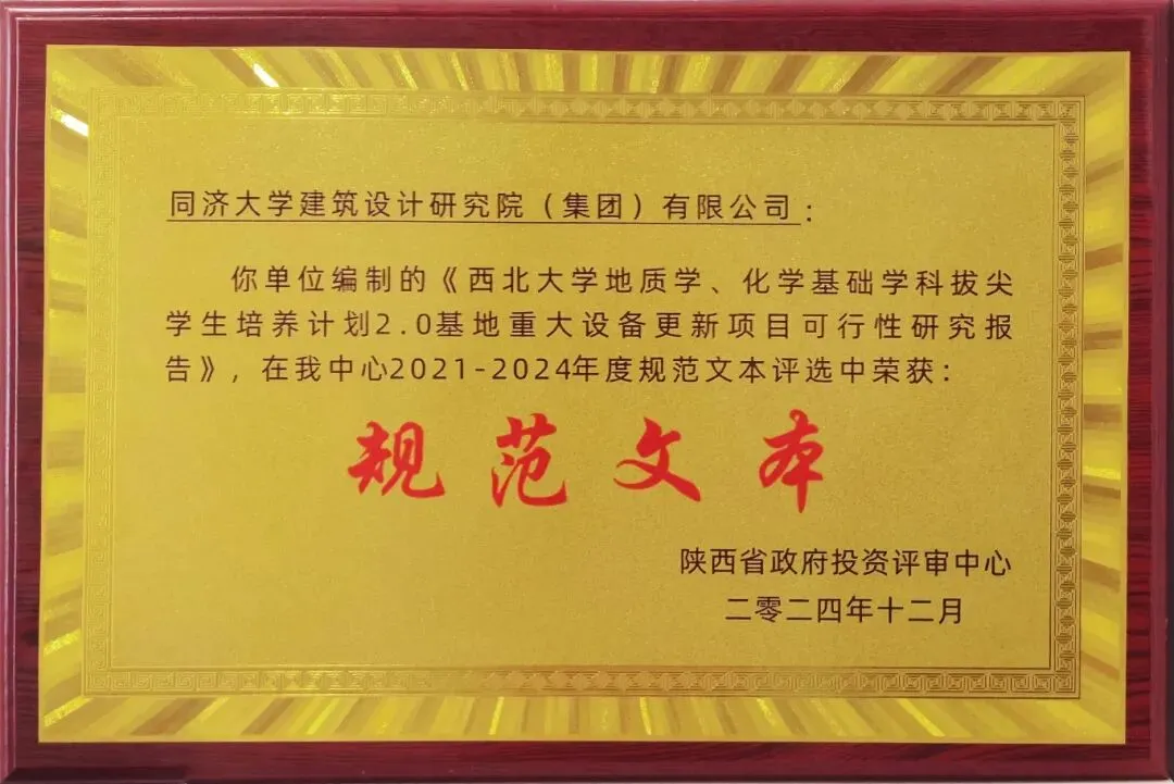 由同济大学建筑设计研究院(集团)有限公司编制的《西北大学地质学、化学基础学科拔尖学生培养计划2.0基地重大设备更新项目可行性研究报告》被评为规范文本,并予以通报表扬。