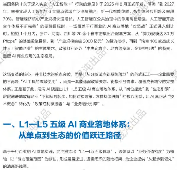 AI不再是技术概念,而是政策红利承接器、业务增长引擎。混沌L1-L5五级体系,把复杂的AI落地拆成清晰的阶梯:从岗位提效到流程协同,从产品创新到原生重构,最终到生态引领,每一步都有方法、有指标、有案例、有政策支撑。