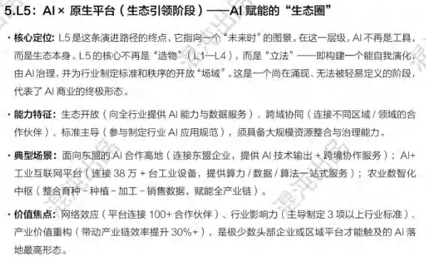 L5是AI商业落地的终极形态,核心不是造物,而是立法——构建AI治理、自我演化、制定行业标准的开放生态,是极少数头部企业与区域平台才能触及的最高阶段。