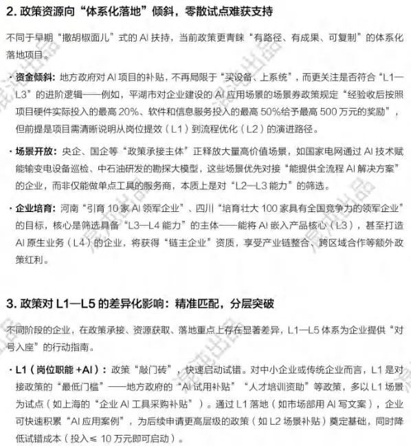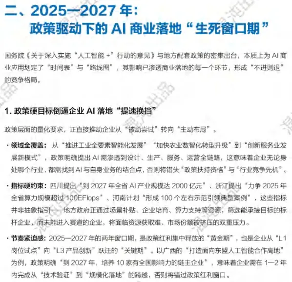 同时,白皮书明确2025—2027是政策驱动的生死窗口期:中央定方向、地方给资源、企业抢机遇,零散试点不再获政策支持,只有体系化落地才能承接补贴、算力、场景开放等红利。不同层级对应不同政策倾斜,企业必须对号入座、分层突破。
