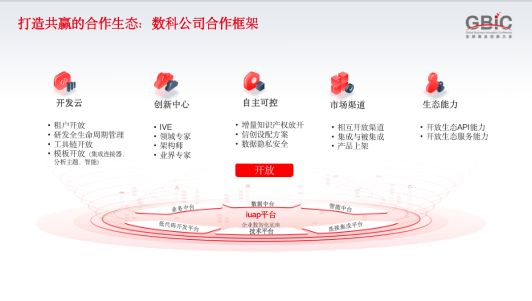 总结来说,第一,用友可以为数科公司提供完整的开发云,帮助数科公司将能力开放、集成;第二,双方可一同打造创新中心,IVE、领域专家、架构师等专业人才将与数科公司联合共创模型能力;第三,进行联合创新以后,知识产权将归属于数科公司;第四,助力数科公司建立市场渠道,让其能够快速触达到客户;第四,开放生态 API 能力、生态服务能力,从而加速数科公司的应用开发。