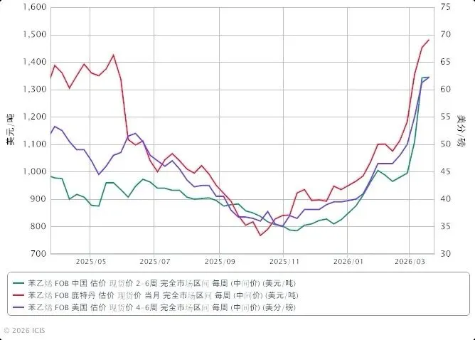 苯乙烯中东供应中断叠加4月亚洲供应紧缩预期,东北亚、东南亚买家紧急补库,中国凭借全球超50%的苯乙烯产能,成为核心供给方,3月出口预计突破10万吨。