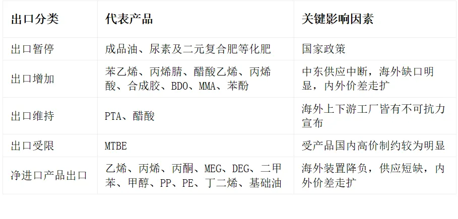 国内化工产能爆发浪潮后,大多产品维持净出口格局,在当前情况下出口数量及目的地进一步增多。
