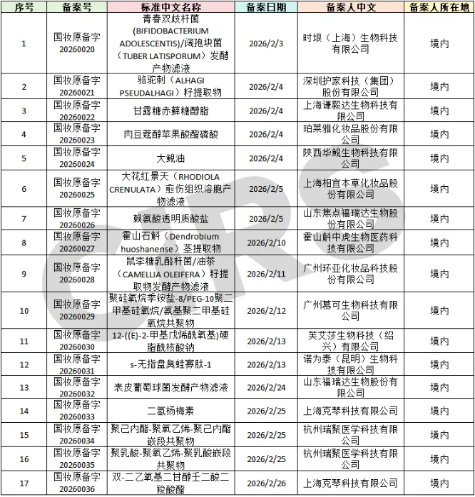 2026年2月中国化妆品新原料备案数