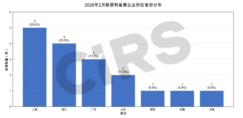 根据对新原料备案数据的分析,17款新原料由中国境内企业完成备案,涉及的15家企业分布于7个省份地区,包括上海、浙江、广东、山东、陕西、安徽和云南。如下图所示,在所有境内备案企业所属省份及地区中上海获得的新原料备案数量最多,为5个,约占2026年2月新原料备案企业总备案量的29.4%。