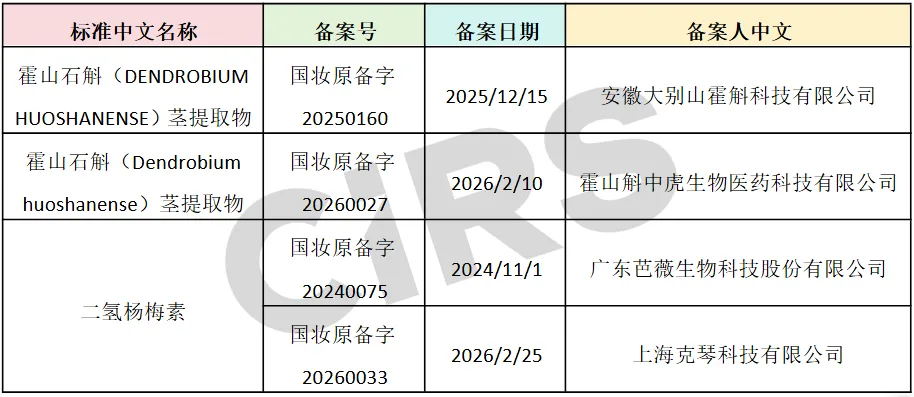 根据统计,如下表所示,上述17款取得化妆品新原料备案号的新原料中,霍山石斛茎提取物和二氢杨梅素目前在不同时间、经不同备案人企业备案2次。