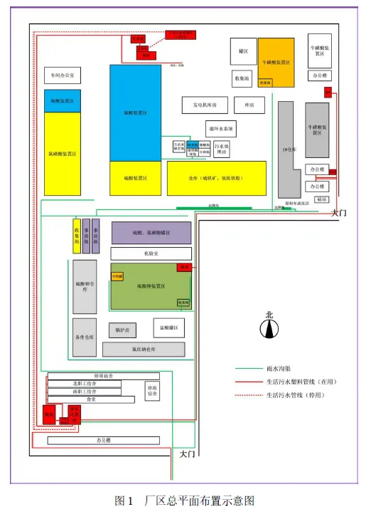 某公司厂区地势北高南低,生产区位于北部,办公区位于南部,生产区主要有硫酸车间、硫酸钾车间、牛磺酸车间等,办公区主要有办公楼、厕所及化粪池、食堂、南职工宿舍、北职工宿舍等。硫铁矿、氧化铁粉仓库位于厂区中北部。