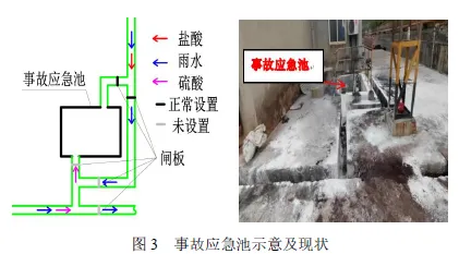 硫酸钾车间东南侧设有事故应急池(长2.5米、宽1.5米、深2米),靠近雨水干渠,设计有5个闸板,其中盐酸装置方向设计有2个闸板,硫酸中间罐方向设计有3个闸板。事故发生时,事故应急池有雨水积存,与盐酸装置连通的闸板设置到位,其他未设置到位。