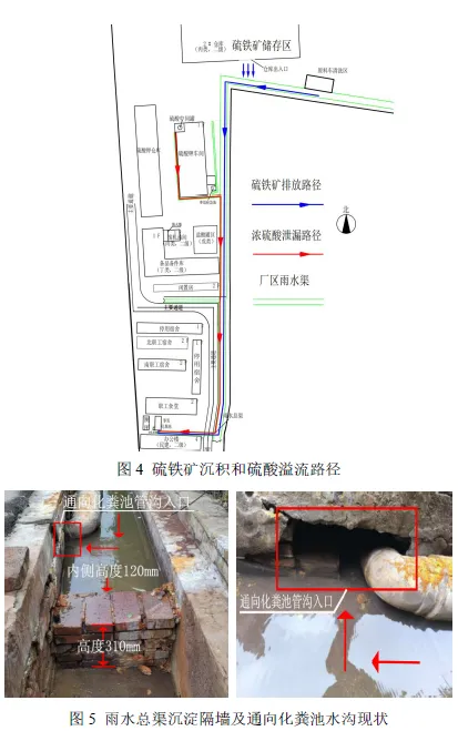 (二)雨污不分流问题长期存在,防护措施层层失守。厂区雨水总渠与办公区化粪池连通,位于厂区北部(厂区北高南低)原料厂房的硫铁矿等物质在运输、清洗、冲刷作用下,借助地势长年排入雨水总渠,通过管沟进入化粪池,并在化粪池内沉积。硫酸钾车间事故废水渠和雨水支渠混用,硫酸溢流后三层防护全部失守,第一层围堰未设置排水切换阀,排放口未有效封堵,从硫酸中间罐溢出去的硫酸通过排放口直接进入雨水支渠;第二层通向雨水干渠的阻隔闸板未封闭,从围堰下泄的硫酸除少部分流入事故池,大部分直接排入雨水总渠,事故池未有效发挥收容作用;第三层雨水总渠和办公区化粪池连通,雨污合流,加之雨水总渠在此处设有沉淀隔墙,导致排入雨水总渠的硫酸通过管沟进入化粪池。