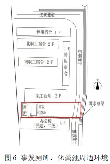 化粪池南侧布置有办公楼,西侧依次有厕所、厂区围墙,北侧依次布置有职工食堂、南职工宿舍、北职工宿舍等,东侧依次是厂区主要通道、雨水总渠、围墙,自东向西沿办公楼北墙设置有地下管沟。全厂生产区和办公区主要生活污水自流进入化粪池,在化粪池预处理后,通过输送泵送至某市市开源污水处理有限公司提灌站。