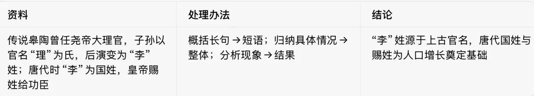 传说皋陶曾任尧帝大理官,子孙以官名“理”为氏,后演变为“李”姓;唐代时“李”为国姓,皇帝赐姓给功臣 概括长句→短语;归纳具体情况→整体;分析现象→结果 “李”姓源于上古官名,唐代国姓与赐姓为人口增长奠定基础