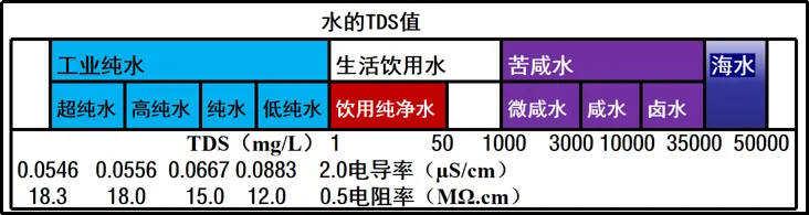 在本文中,把TDS值为1mg/L~50mg/L、其余水质指标符合GB5749标准的水定义为饮用纯净水。称TDS值<50mg/L的水为低TDS水。TDS值<1mg/L的工业纯水和TDS值>1000mg/L的苦咸水是不宜喝的,海水更是不能喝的。