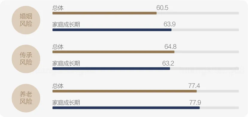 进入家庭成长期,婚姻稳定和未来养老规划都成为大家心里的重头戏。其中,婚姻风险关注度达到63.9分,较总体高3.4分。此外,大家对养老风险关注度也首次超越总体,开始着手为未来的养老做打算。