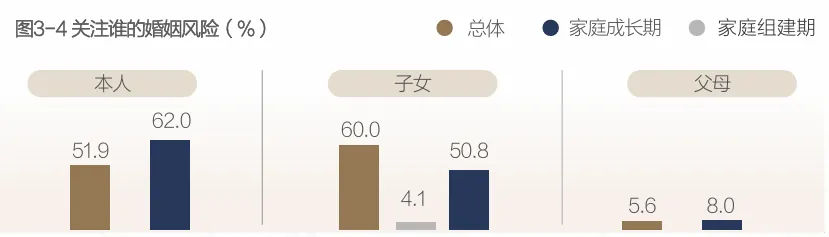 处于家庭成长期的中高净值人群对自己的婚姻问题盯得最紧,62.0%的人关注本人婚姻状态,高于总体10.1%。更有意思的是,处于家庭成长期的人们对子女婚姻风险的关注度迅猛增长,由组建期的4.1%飙升到50.8%,孩子的婚姻问题开始成为大家新的“操心点”。