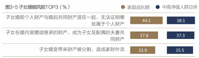 家庭成长期对子女的婚姻风险担忧显得“精准又浓烈”。孩子渐渐到了婚恋年纪,但社会经验少,家庭又有了不少的财富积累,这使得父母对子女婚姻中的财产安全问题愈发关注。从子女婚姻风险担忧TOP3来看,大家最担忧的是子女婚前个人财产与婚后共同财产混合在一起,无法证明哪些属于个人财产,占比达到44.1%,较中高净值人群总体关注度高6.0%。毕竟家庭积累财富不易,父母期望精准传给子女,不想因子女婚姻问题而产生变故。
