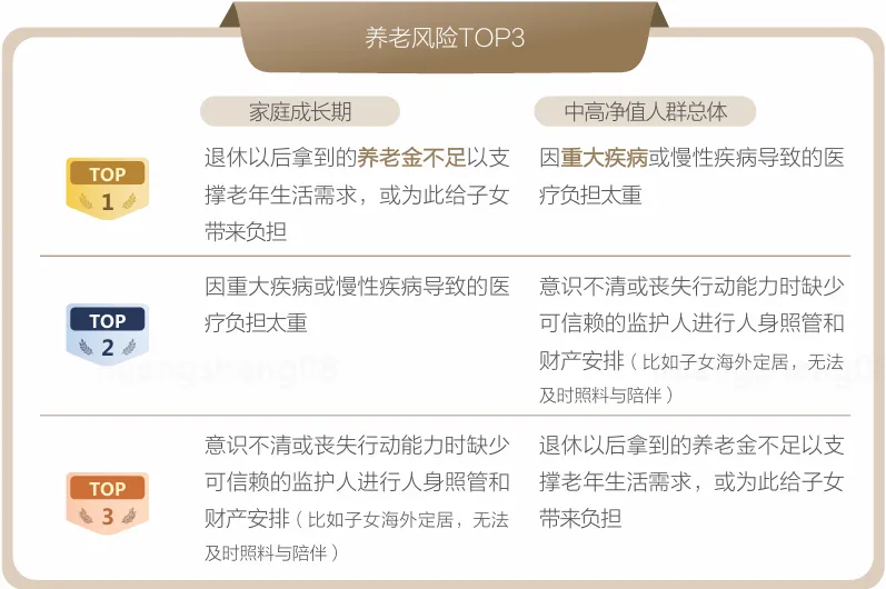 处于家庭成长期的中高净值群体,虽说当下满心思都在子女身上,可对自己养老的事也没少挂心。从家庭成长期养老风险TOP3来看,大家最担心的是退休后养老金不够花,给子女添负担,这一担忧明显高于中高净值人群总体水平;其次是怕生场大病,医疗负担重;此外也担忧自己万一意识不清或行动不便时,没有靠谱的人照管自己和处理财产,特别是子女如果在海外定居,想及时得到照料和陪伴就更难了。