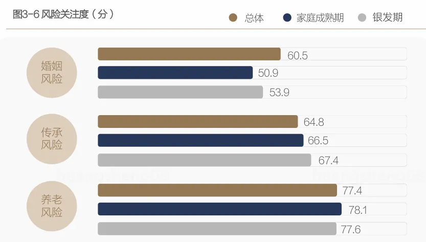 在家庭成熟期和银发期,人们的心思和之前大不相同。子女离家独立,老两口重归二人世界,操心的事也从婚姻,转向了财富传承和养老安排。从大家对风险的关注度来看,对婚姻风险的操心渐渐少了,对传承风险的关注度一路走高,在银发期达到顶峰。而对养老风险的关注,则在家庭成熟期出现了小高峰。