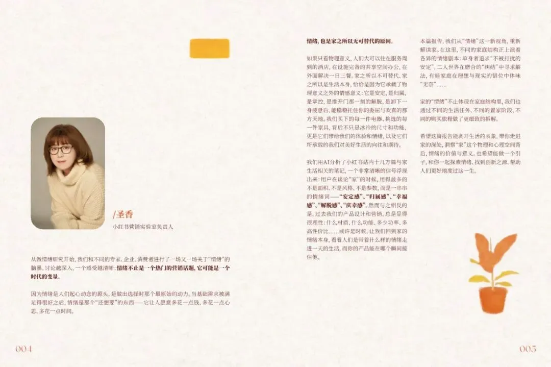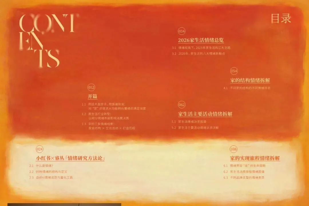 这份由小红书与睿丛咨询联合发布的《2026家生活情绪需求洞察白皮书》,不仅仅是一份行业趋势报告,更是一份关于中国家庭消费心智变迁的“情绪地图”与品牌行动纲领。以下是对其核心内容的深度解读与分析:1. 核心论断:定义“情绪化时代”,消费决策逻辑发生根本性转变报告开宗明义,提出了一个根本性的时代判断:家生活消费的驱动引擎,正从过去的“效率逻辑与功能参数”竞争,全面转向“情绪满足与意义建构”。当物质丰裕、功能趋同,“家”的核心价值已从物理空间的“够用、好用”,升维为能精准“接住”居住者细微、高频情绪起伏的“心理容器”。消费的下一站不再是“更多”,而是“更深”。这标志着品牌与用户的对话方式,必须从理性说教转向情感共鸣。2. 构建系统性的“情绪研究方法论”,让感性洞察可量化、可运营报告最大的理论贡献在于,它没有将“情绪”停留于模糊的营销概念,而是与睿丛咨询共同构建了一套科学的、可量化的情绪研究体系。• 95种情绪的精确定义:基于情绪的三层来源(生存适应性、社会适应性、超越性),定义了35个大类、95种具体情绪(如“庆幸感”、“解脱感”、“纠结感”),为精细化分析提供了“词典”。• 自研AI情绪追踪与量化工具:基于方法论,用AI分析了站内超过12万条家生活笔记,将用户的自然表达转化为可追踪的“情绪数据”,并创新性地提出“情绪浓度”指标,用于交叉比较不同维度下的核心情绪诉求。这使得“读懂情绪”从艺术变为科学。报告没有泛泛而谈,而是沿着三条交织的线索,立体化地绘制了情绪生成的图谱:• 家庭结构线索:深刻揭示了不同家庭单元的核心情绪剧本。例如,一人独居追求“安定感”,二人世界充满“纠结感”,有娃家庭常感“无奈”,有宠家庭收获“逗趣感”,多代同堂则萦绕“担心感”。这要求产品与沟通必须“因家而异”。• 生活活动线索:将家生活解构为饮食、洗护、环境维持、娱乐、养育、睡眠六大活动,并逐一分析其核心情绪诉求。例如,饮食活动的诉求是“忙而不乱”的掌控感与畅爽;环境维持(清洁整理)的终极诉求是“彻底理顺”后的解脱与知足;睡眠则关乎“彻底安全放松”的掌控感与解脱感。这为产品场景化创新提供了精准坐标。• 实现旅程线索:将“家”的打造分为“第一次”和“焕新”两大阶段,并详细绘制了包含八大步骤的消费旅程情绪图谱。报告指出,在“第一次”阶段,用户的“担心感”远超“买贵”,更怕“买错”;而在“焕新”阶段,“畅爽感”则来自于一次性解决那些忍了很久的“微痛点”。这提示品牌需要在不同决策节点提供差异化的情绪支持。基于数据洞察,报告前瞻性地指出了六大情绪新触点,它们正是未来产品创新与营销沟通的关键机会点:1. 欣赏感:从“第一眼惊艳”转向近距离、可反复品味的“质感之美”。2. 掌控感 & 知足感:家务智能进化的终点是“家务隐身,空间自愈”,把时间还给用户。3. 惊喜:源于击破“微痛点”(如难清的发丝、水槽霉斑),对生活瑕疵的容忍度在降低。4. 欣慰:孩子/宠物的喜好被认真纳入家庭决策,它们拥有“一票否决权”。5. 无奈:集中爆发于售后环节,复杂家电时代,用户需要的是可长期“订阅”的可靠生活服务。6. 担心感:健康标准升级,关注点从“看得见”的安全转向“看不见”的微观隐患(如管线水垢、结构死角细菌)。5. 针对不同品牌类型,提出差异化的情绪心智构建策略报告没有给出笼统建议,而是精细拆解了四类品牌的情绪心智现状与破局点:• 综合集团型:凭借“全方位安全感”建立信赖,应强化“全屋智联”和“服务确定性”。• 高端/专业型:虽有专业信赖,但伴随高“纠结感”与“遗憾”,需用“极致体验”和“确定性服务”破除顾虑。• 超高端型:是用户彰显“我是谁”的资产,情绪核心是“优越感”与“欣赏感”,售后应升级为“资产养护”。• 国产新锐型:享有“更懂中国家庭”的期待,但面临“品质信任”挑战,需从“性价比”快速转向“心价比”,并建立用户“共创感”。6. 升华至战略层面:情绪应成为品牌全链路布局的底层逻辑报告的最终结论将“情绪”的价值从营销层面提升至企业战略高度:• 在内容层面,情绪决定了“被看见”的方式,影响信任构建的速度与深度。• 在产品层面,情绪决定了“是否被需要”,产品创新实质是在回应那些未被说出口的细微情绪断点。• 在品牌层面,情绪决定了“是否被记住”,关乎品牌人格化叙事、体验与社群关系的构建。因此,情绪营销的本质,是将对情绪的系统性洞察,转化为一套可持续投入和管理的全链路工作方式,这才是家生活品牌获取未来增长、赢得用户长久信赖的终极路径。总结而言,这份白皮书成功完成了一次从“感性认知”到“理性运营”的关键跨越。它既是一份基于海量真实用户数据绘制的、前所未有的中国家生活情绪深度图谱,揭示了从家庭结构到生活场景的细微需求;更是一份具备高度可操作性的品牌战略指南,为家生活品牌如何围绕“情绪”重构产品研发、场景创新、内容沟通与用户服务,提供了从方法论、洞察框架到具体策略的完整行动方案。在行业高度内卷的当下,它明确指出:未来的竞争优势,不在于参数的堆砌,而在于品牌是否拥有深刻的“情绪智慧”和“情绪定价权”。部分内容预览