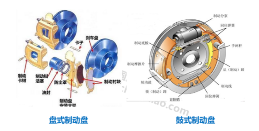工作原理:利用刹车片和刹车鼓及轮胎与地面的摩擦将车辆行进的动能转换成摩擦后的热能,将车子停下来。