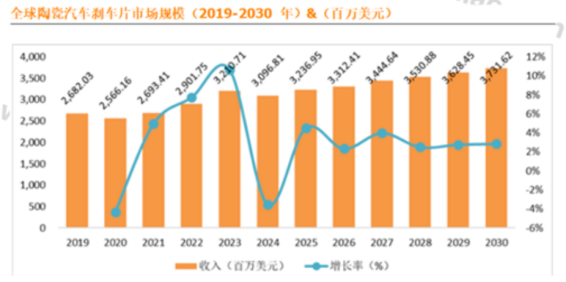 根据行业的市场研究报告《2024-2030年全球陶瓷汽车刹车片市场报告》显示,2023年全球陶瓷汽车刹车片市场价值32亿美金市场规模,预计2030年将达到37亿美金的规模,2024-2030年预测期内复合年增长率3.16%。