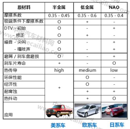 材料分类:石棉刹车片(基本淘汰)、半金属刹车片、少金属刹车片、NAO配方刹车片、陶瓷刹车片、NAO陶瓷刹车片。