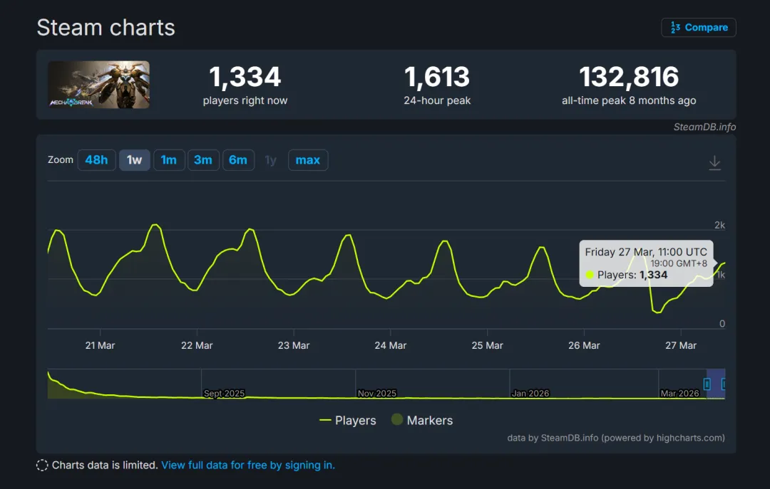 如果说老游戏下滑尚在预期之内,而为了开拓新赛道的《解限机》市场表现则给了西山居沉重一击。这款投入多年研发资源、试图跳出「武侠」舒适区的科幻机甲大作,在Steam上线后经历了典型的高开低走。