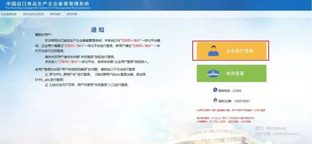 通过以上两种方式,进入出口食品生产企业备案核准系统,点击企业用户登录按钮,输入用户名和密码进行登录。