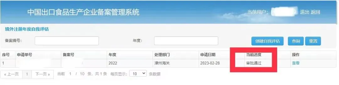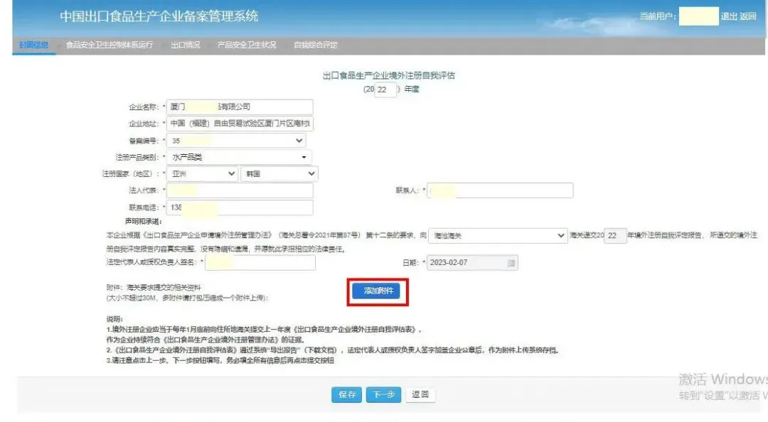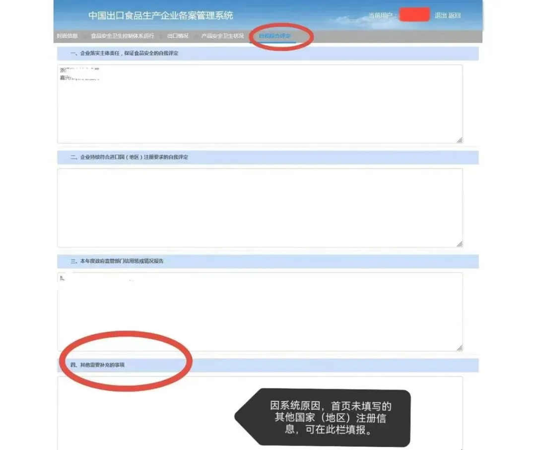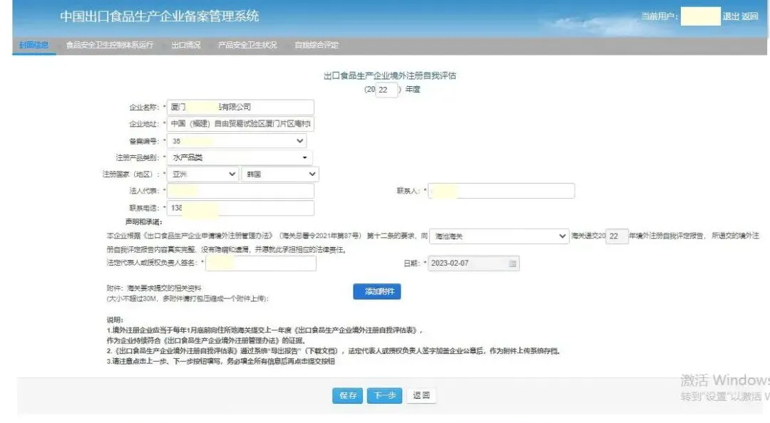 上述内容经核对填写完整、无误后点击“保存”,并通过“导出报告”按钮生成《出口食品生产企业境外注册自我评估表》,经法定代表人或授权负责人签字加盖企业公章后,作为附件上传系统存档。提交成功后可在首页查看当前进度。