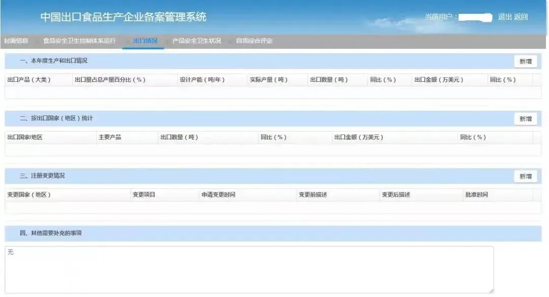 按要求填写上年度生产和出口情况、出口国家(地区)统计情况以及注册变更情况。