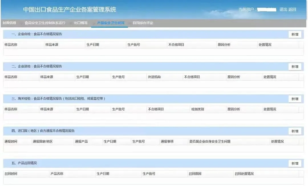 分别填写企业自检、企业送检、海关检验和进口国(地区)官方通报不合格情况。