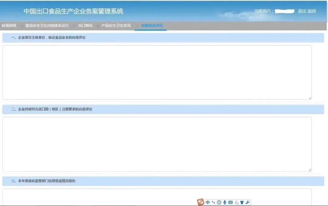 分别填写企业落实主体责任保证食品安全的自我评定、持续符合进口国(地区)注册要求的自我评定和本年度政府监管部门信用惩戒情况。