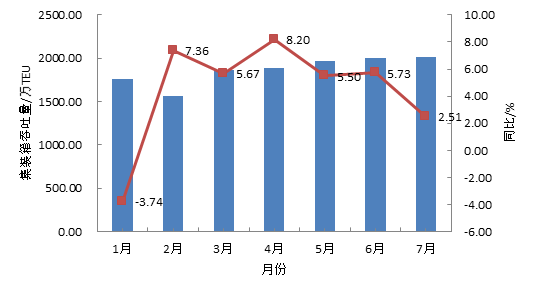 据上海航运交易所的资料,7月中国出口集装箱运输市场继续调整行情,运输需求基本稳定,多数远洋航线市场运价下行,7月上海航运交易所发布的中国出口集装箱综合运价指数平均值为869.89点,较上月平均下跌5.3%;反映即期市场的上海出口集装箱综合指数平均值为976.63点,较上月平均上涨1.3%。